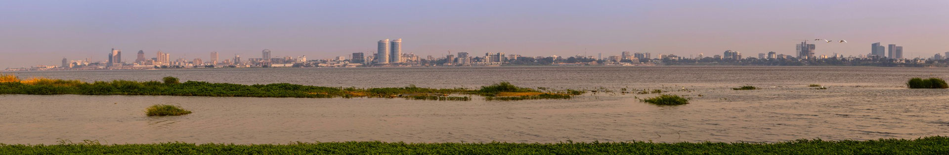 Die Skyline von Kinshasa am gegenüber liegenden Ufer des Kongo (Luftlinie ca. 4,5 km entfernt)