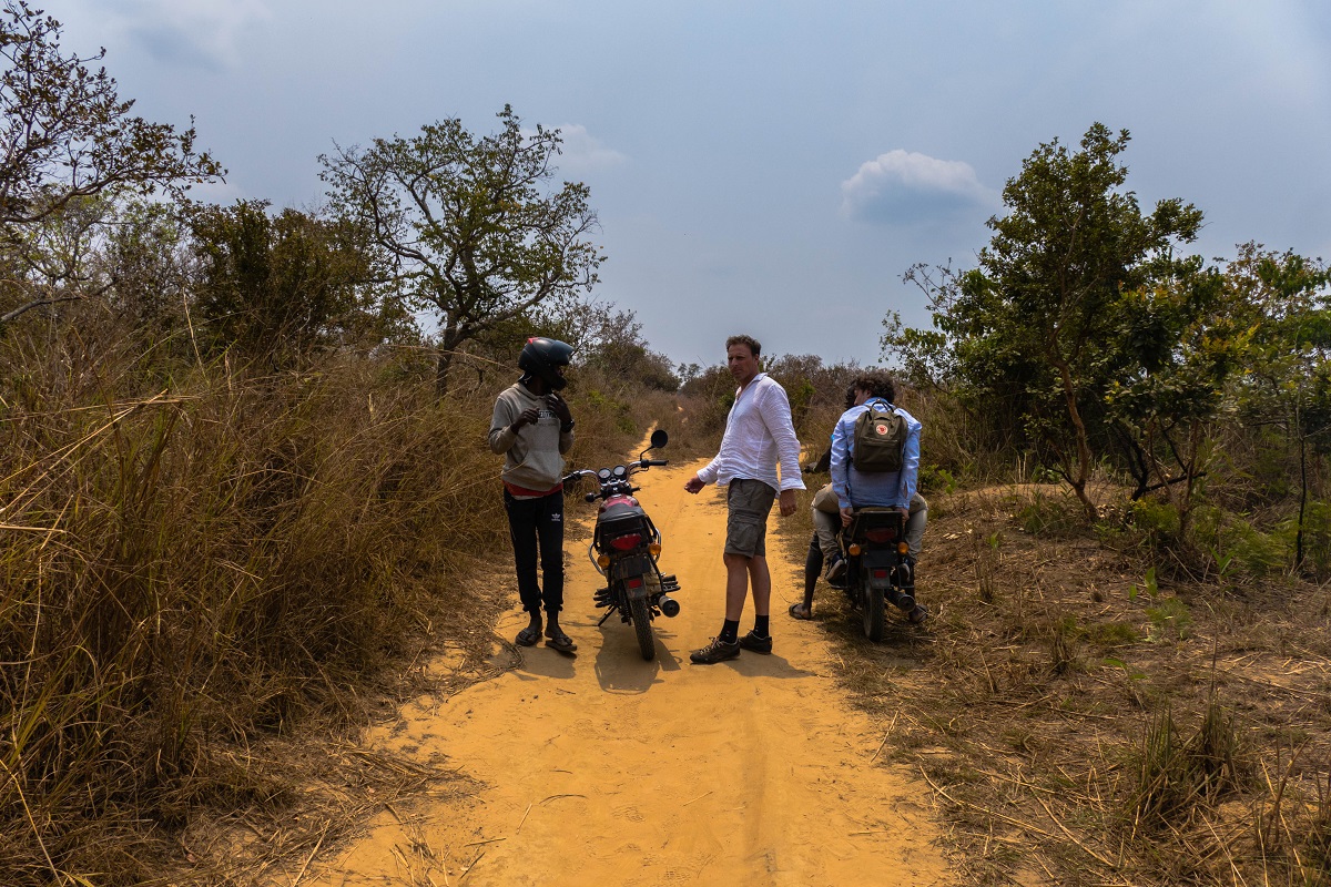 Wir stoppten nach ca. einer Stunde Fahrt. Es wurde debattiert und uns am Ende das Ergebnis mitgeteilt. Angeblich sollte eine Gruppe der Bonobos nicht weit entfernt von dieser Stelle sein, doch war weit und breit keiner der einheimischen Tracker zu sehen. Für uns gab es keinen Versuch, Bonobos bereits am Nachmittag zu sehen. Auf Grund des noch fehlenden dritten Autos fuhren wir sofort zum Camp von M'bou Mon Tours weiter, denn der andere, grössere Teil unserer Gruppe wartete ja in Tshumbiri, abgeholt zu werden und brauchte unser Auto. Wir kamen uns alle ein wenig veralbert vor, ändern konnten wir es aber eh nicht.