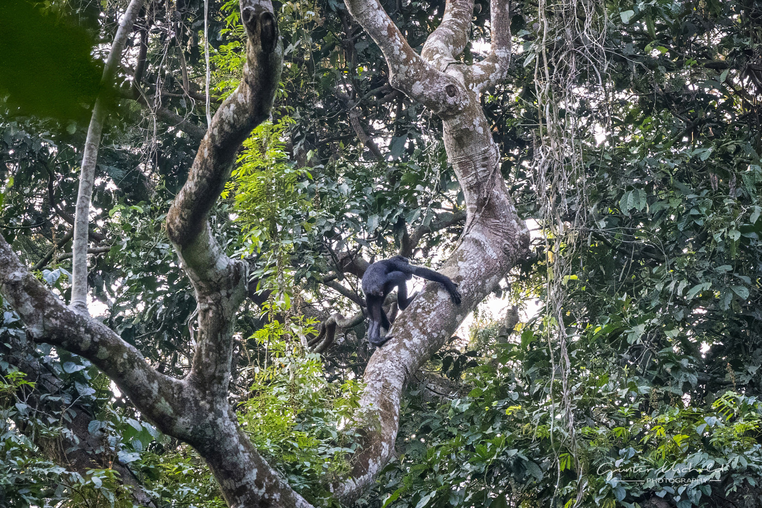 Die beste Zeit, Bonobos zu beobachten, ist, wenn sie aufwachen. Um 03:30 Uhr klingelte unser Wecker. 04:00 Uhr war Abfahrt, denn wir hatten ein ganzes Stück mit dem Auto zu fahren, ehe wir unseren Fährtenleser trafen, der uns zu dem Ort führte, wo seine Schützlinge hoch oben in den Bäumen ihre Nester für die Nacht gebaut hatten. Nun ging es ca. eine Stunde zu Fuss weiter. Erst liefen wir in der Dunkelheit auf einem Pfad durch ein offenes Gelände, dann durchquerten wir ein Waldstück, erneut offenes Gelände, bis wir in ein weiteres Waldgebiet kamen. Der Trampelpfad endete irgendwann und nun ging es nur noch durch dichtes Unterholz, bis wir die ersten Bonobos hoch über unseren Köpfen im ersten Licht des Tages erblickten.