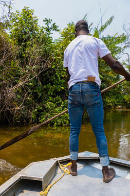 Wir waren mit kleinen Booten auf dem Fluss Lèsio mit seiner üppigen Ufervegetation unterwegs.
