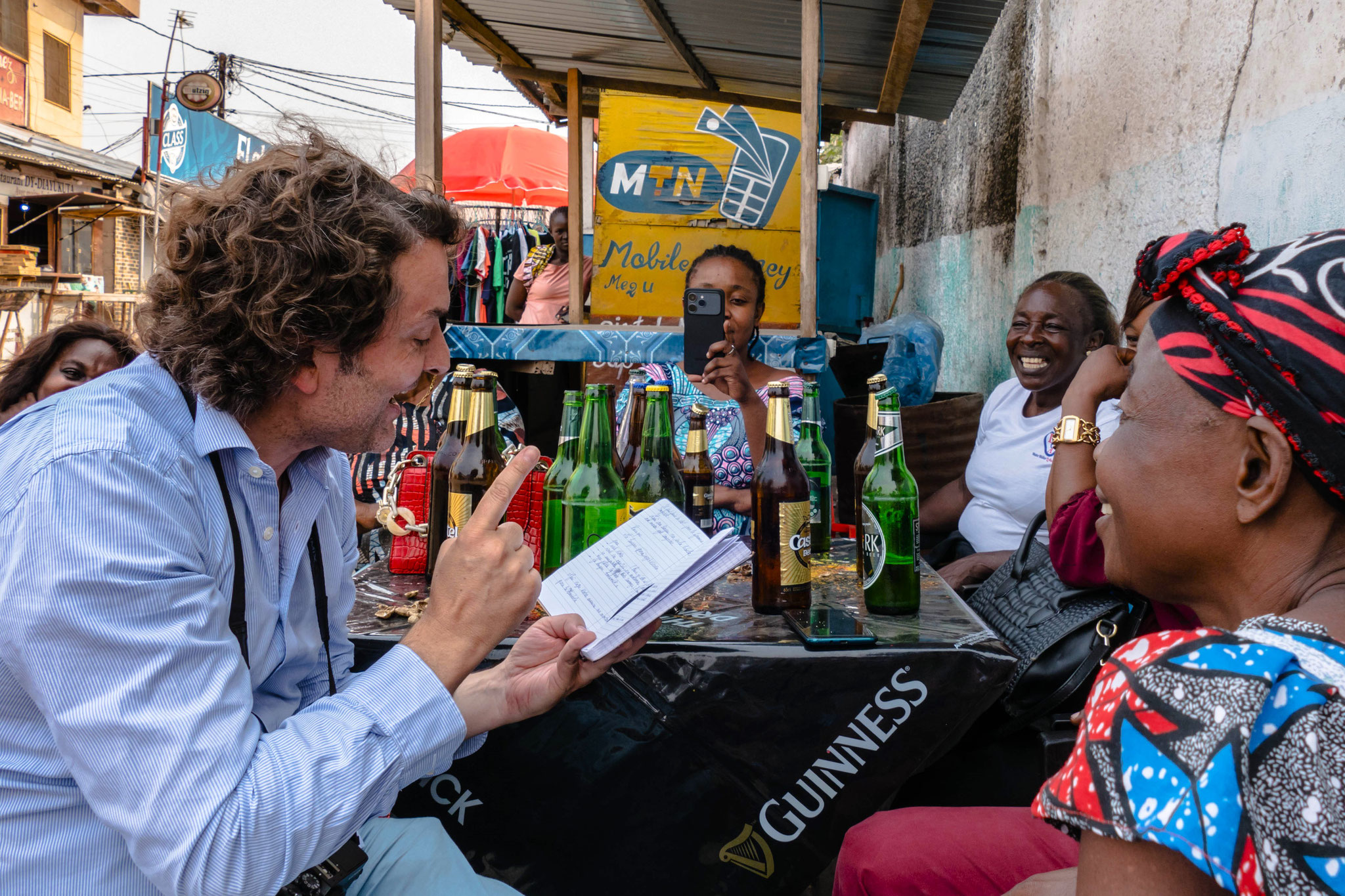 Marc hatte sich am Nachbartisch bei einer illustren Damenrunde niedergelassen, zückte sein Notizheft und versuchte in Lingala mit ihnen zu kommunizieren - sie hatten wohl alle grossen Spass dabei.